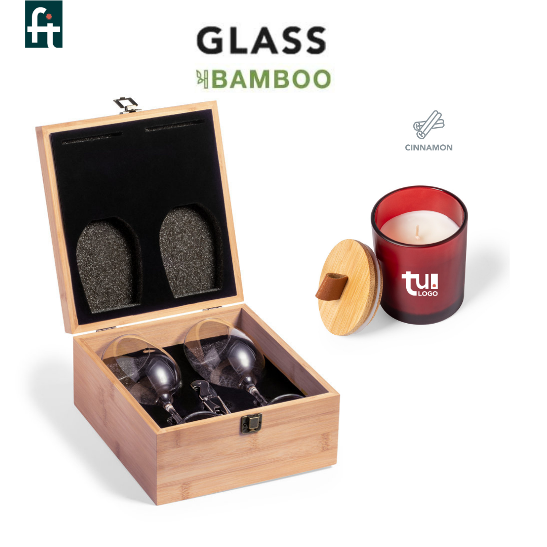 - Set de copas en estuche de bambú, incluye 2 copas de cristal de 350 ml y sacacorchos